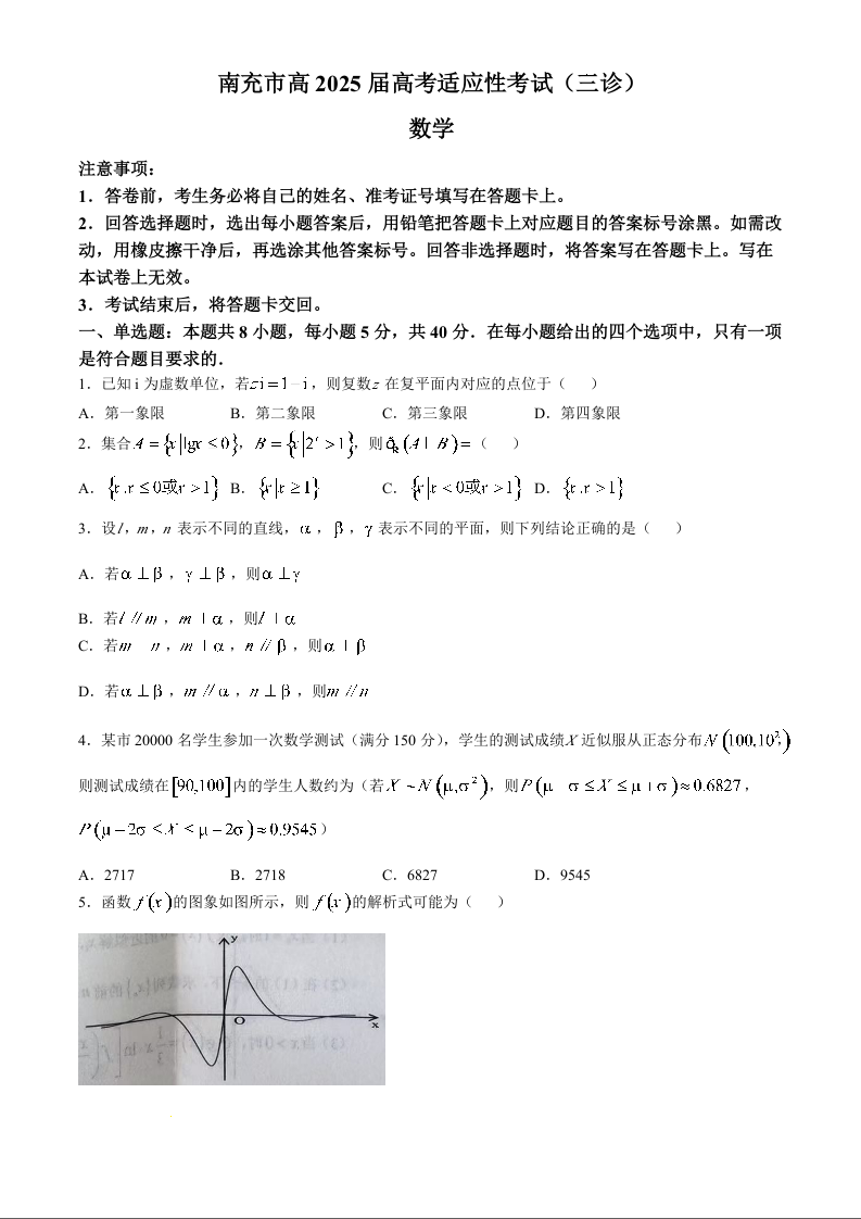 四川省南充市高2024-2025学年下学期高考适应性考试(三诊)数学
