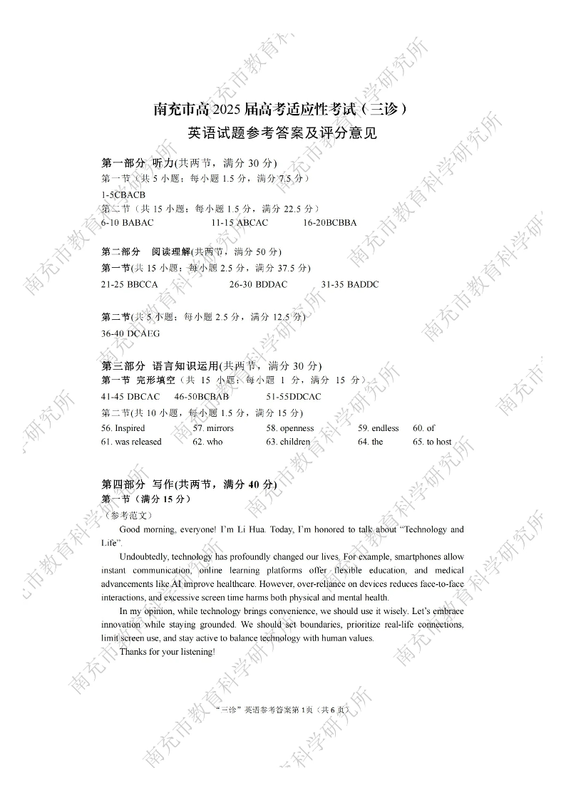 四川省南充市高2024-2025学年下学期高考适应性考试(三诊)英语答案