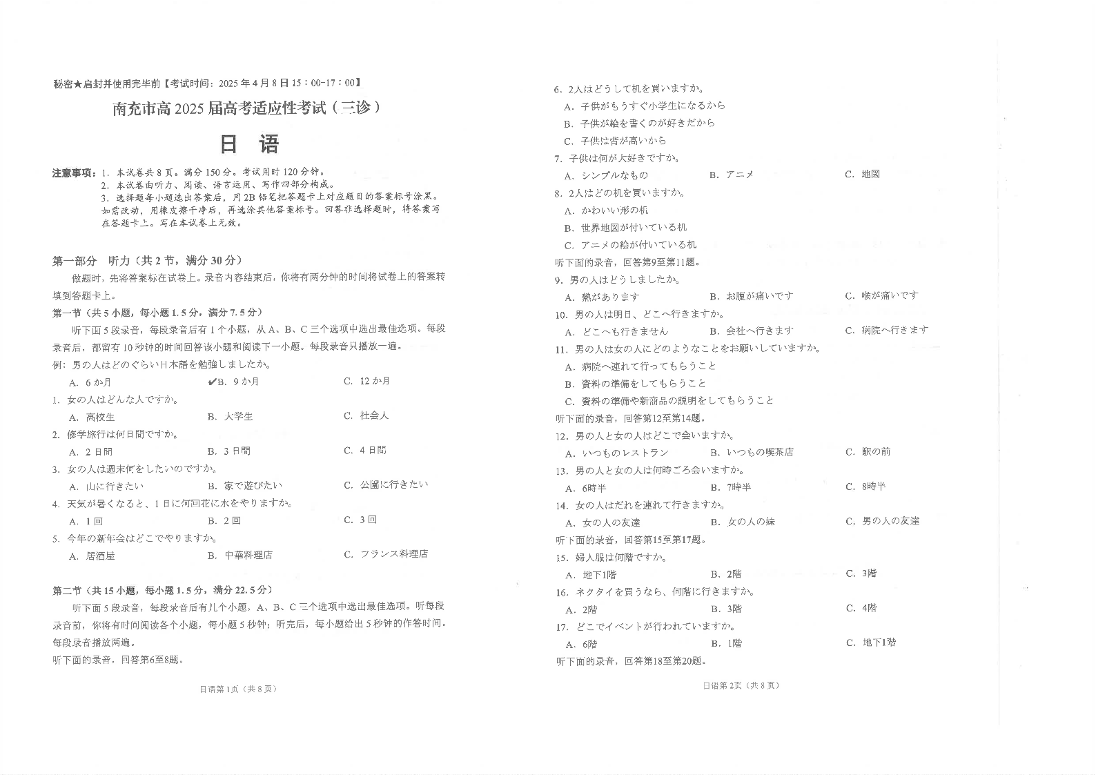 四川省南充市高2024-2025学年下学期高考适应性考试(三诊)日语