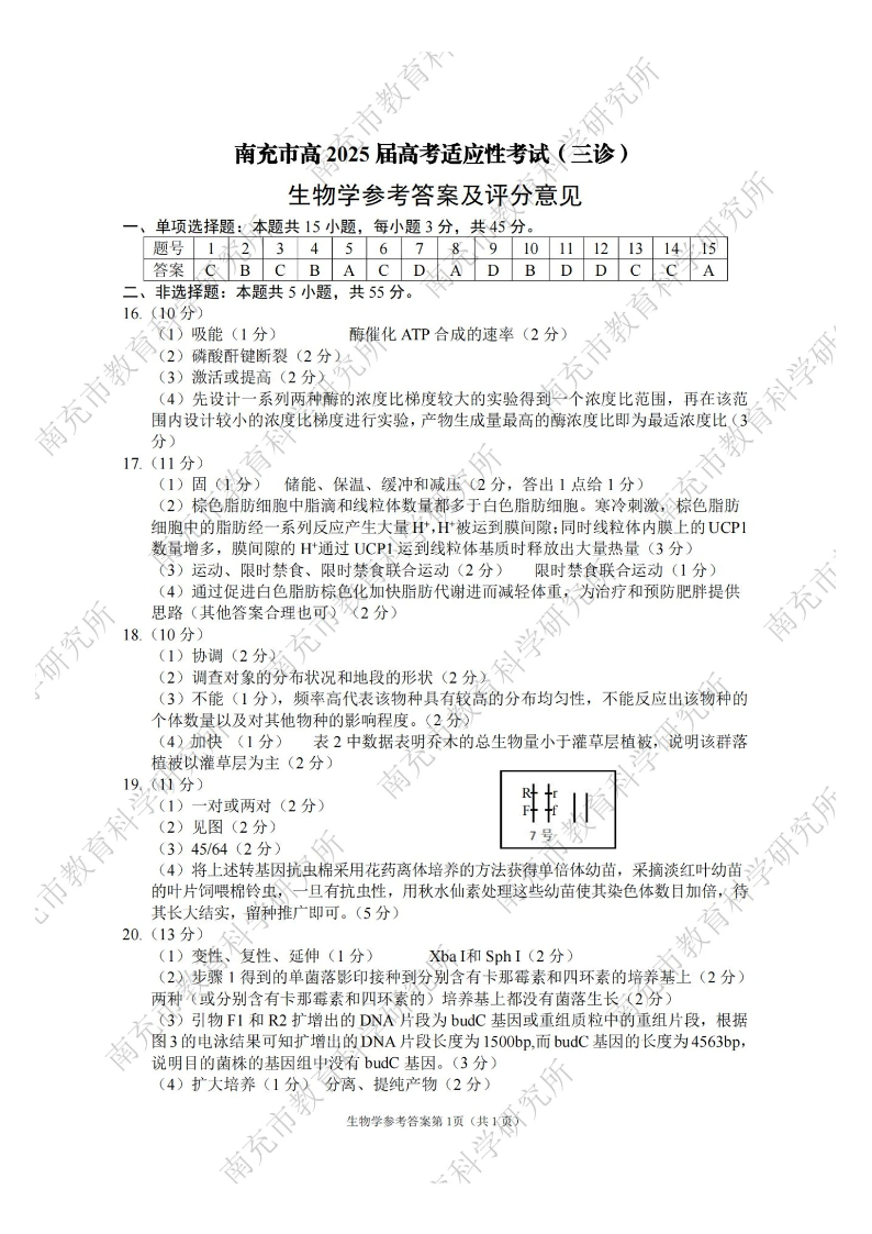 四川省南充市高2024-2025学年下学期高考适应性考试(三诊)生物答案