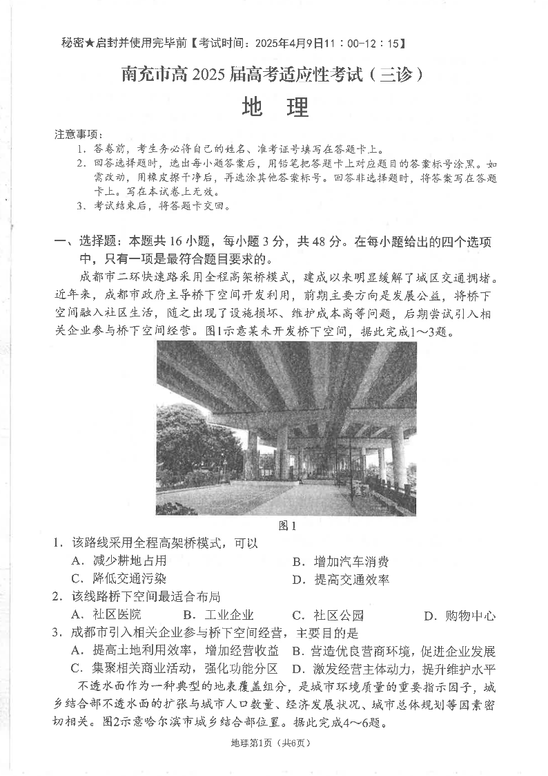 四川省南充市高2024-2025学年下学期高考适应性考试(三诊)地理