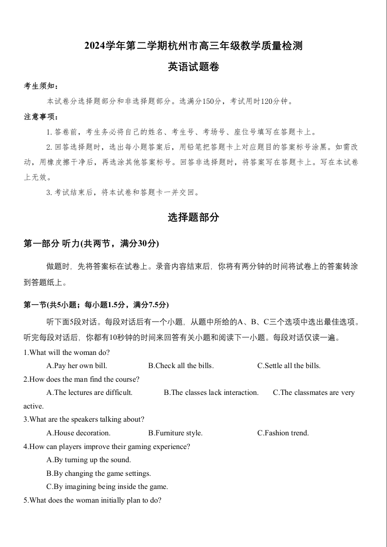 浙江省杭州市2024-2025学年高三教学质量检测(二模)英语