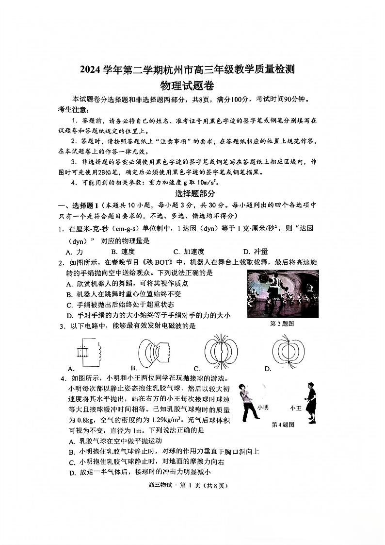 浙江省杭州市2024-2025学年高三教学质量检测(二模)物理