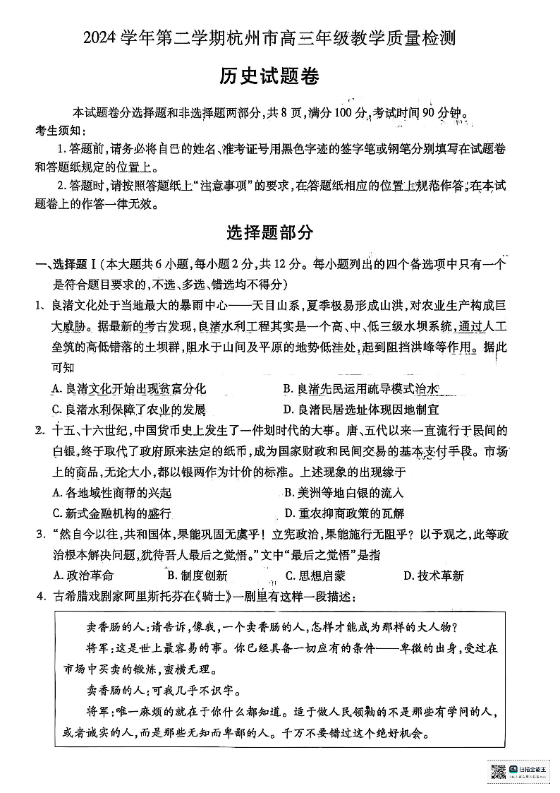 浙江省杭州市2024-2025学年高三教学质量检测(二模)历史+答案