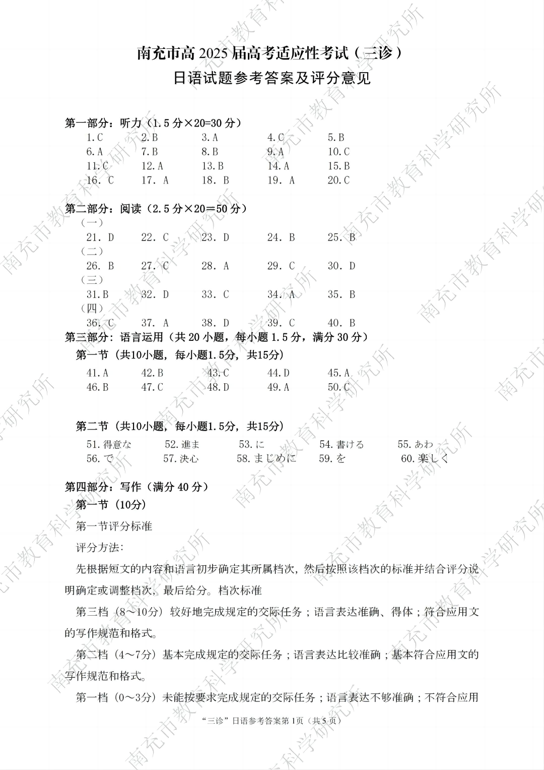 四川省南充市高2024-2025学年下学期高考适应性考试(三诊)日语答案