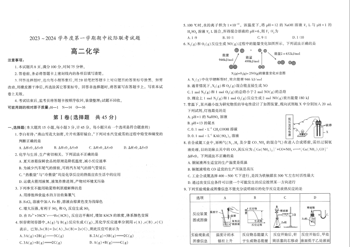 陕西省学林高中校际联考2023-2024学年高二上学期11月期中试题化学+答案