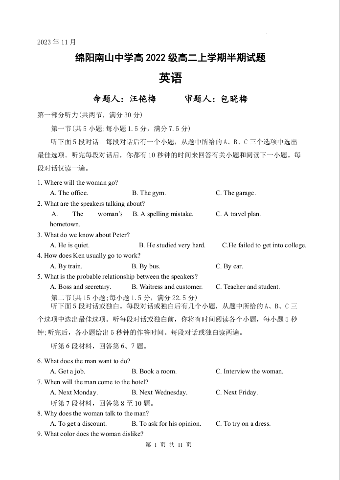 四川省绵阳市南山中学2023-2024学年高二上学期期中考试试卷英语