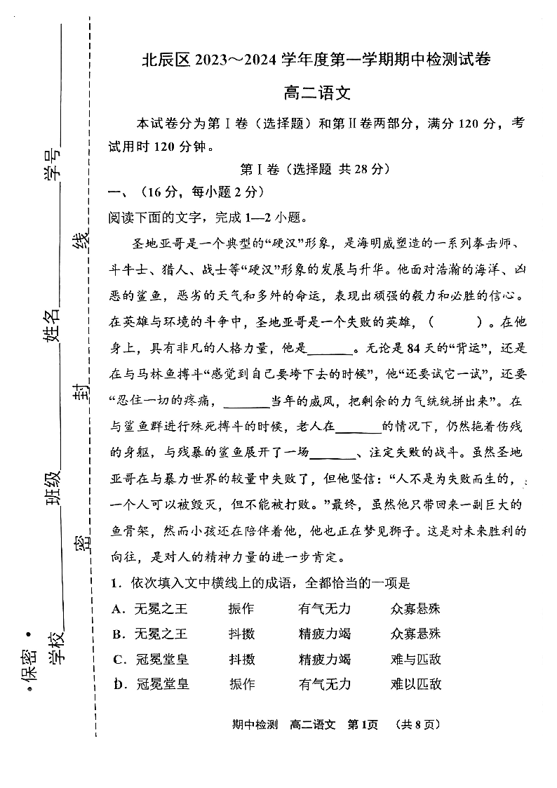 天津市北辰区2023-2024学年高二上学期11月期中试题语文