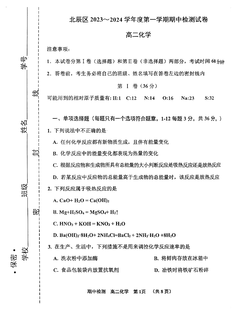 天津市北辰区2023-2024学年高二上学期11月期中试题化学