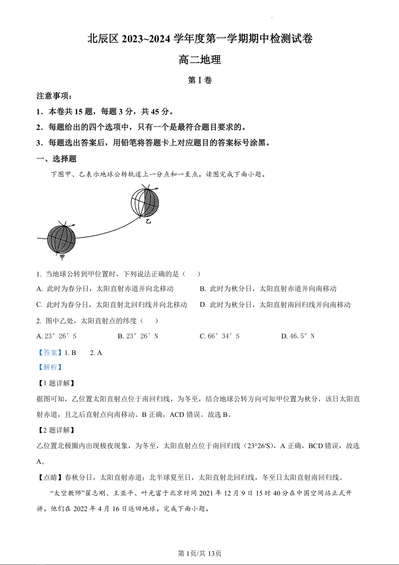 天津市北辰区2023-2024学年高二上学期11月期中试题地理(精品解析版)