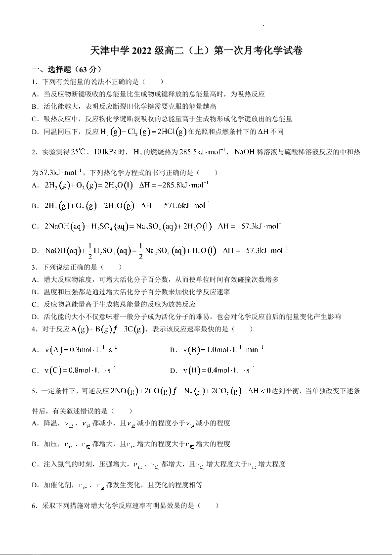 天津市天津中学2023-2024学年高二上学期第一次月考试题化学