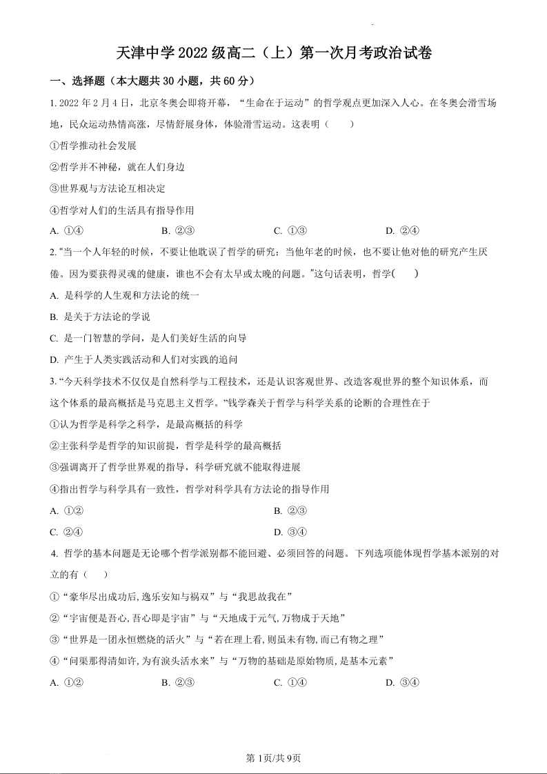 天津市天津中学2023-2024学年高二上学期第一次月考试题政治(原卷版)