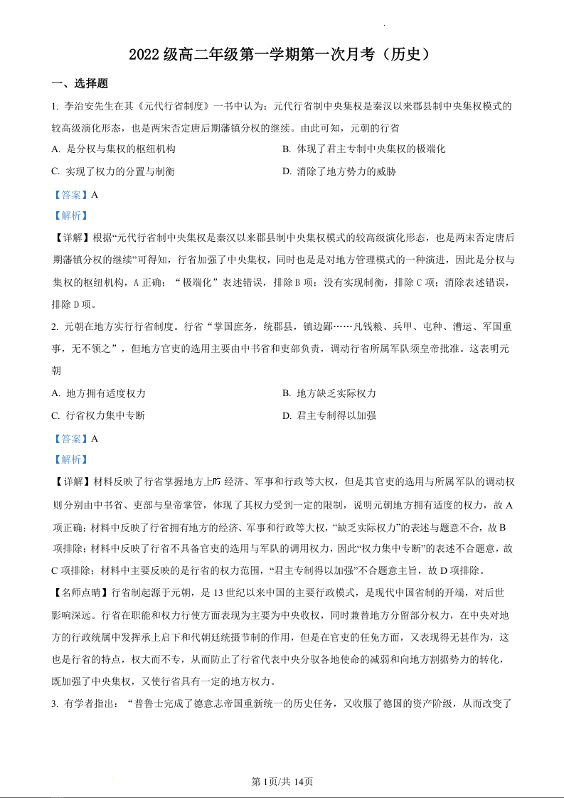 天津市天津中学2023-2024学年高二上学期第一次月考试题历史(精品解析版)