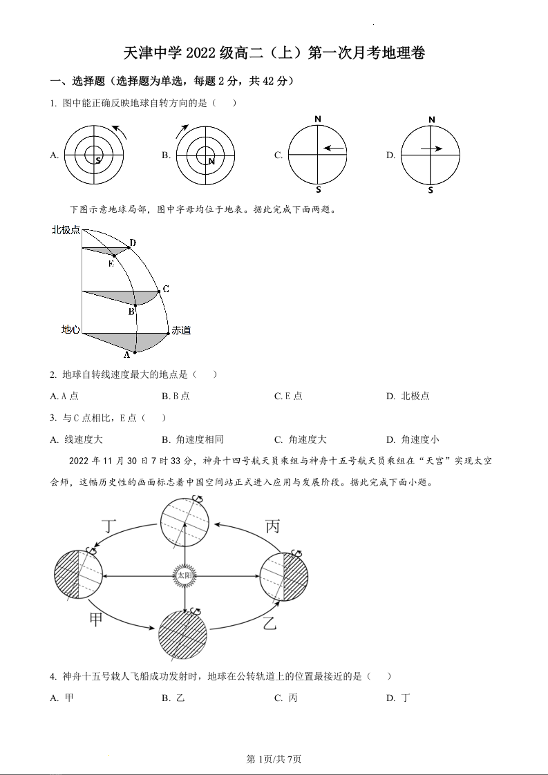 天津市天津中学2023-2024学年高二上学期第一次月考试题地理(原卷版)