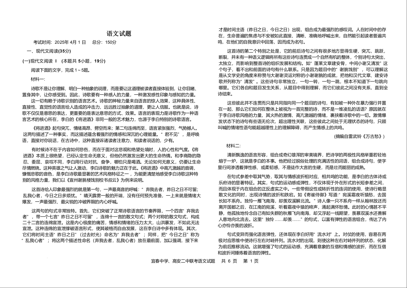 江西省宜春市部分学校2024-2025学年下学期4月高二联考语文