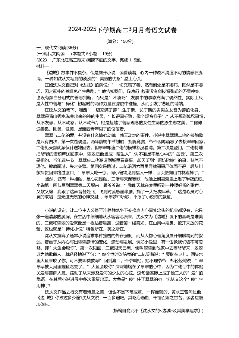 江西省赣州市大余县部分学校2024-2025学年下学期3月高二月考语文