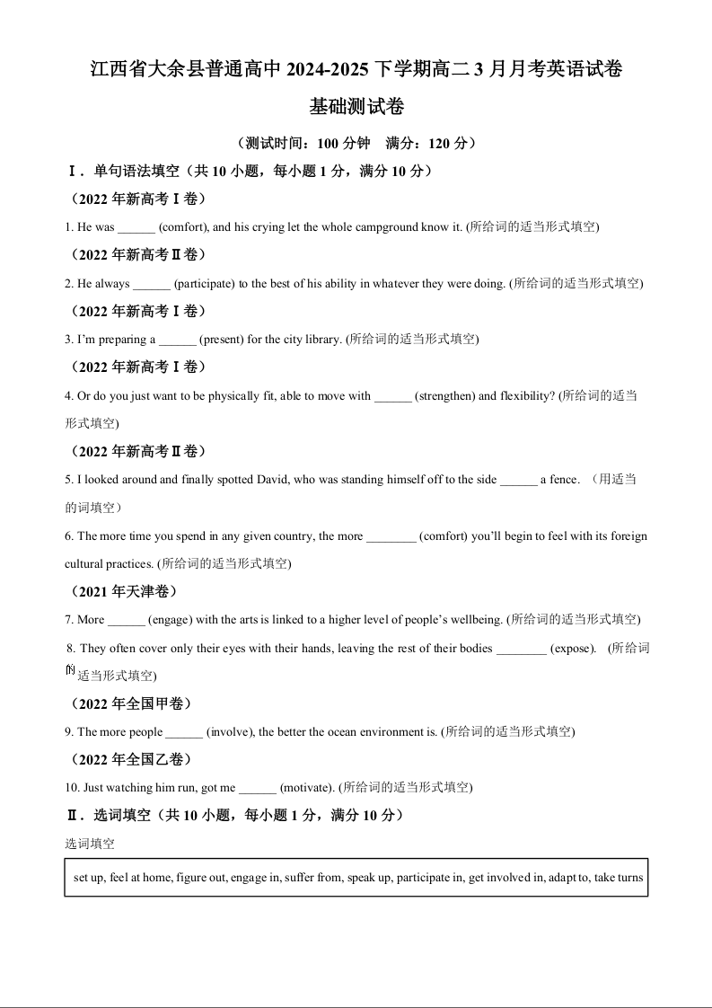 江西省赣州市大余县部分学校2024-2025学年下学期3月高二月考英语+答案