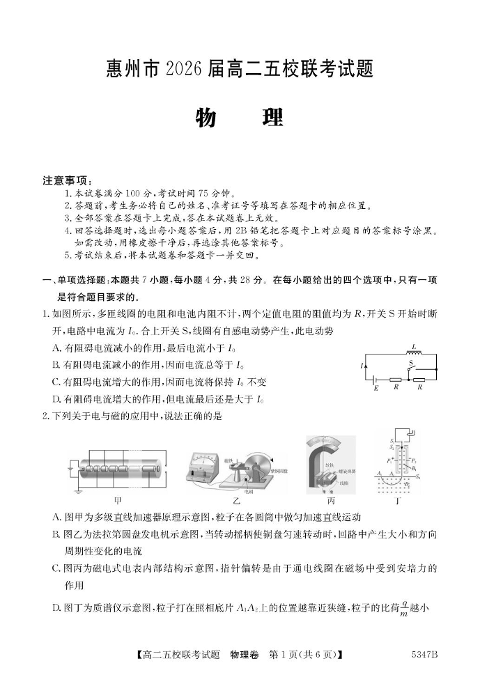 广东省惠州仲恺中学等五校2024-2025学年高二下学期4月联考物理+答案