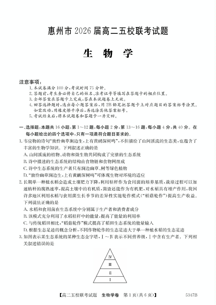 广东省惠州仲恺中学等五校2024-2025学年高二下学期4月联考生物+答案
