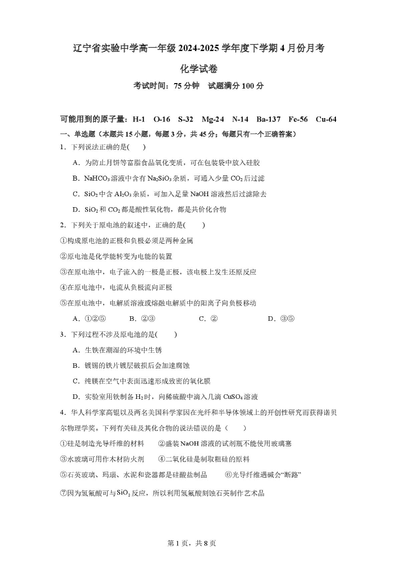 辽宁省实验中学2024-2025学年高一下学期4月月考化学+答案