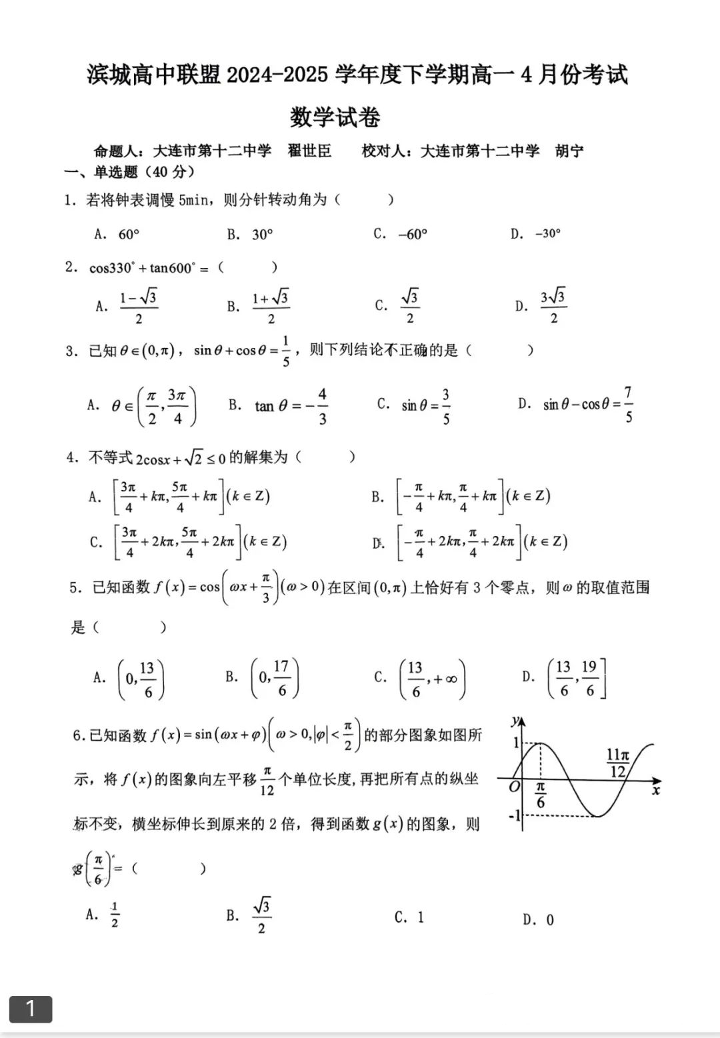 辽宁省大连市滨城联盟2024-2025学年高一下学期4月月考数学+答案