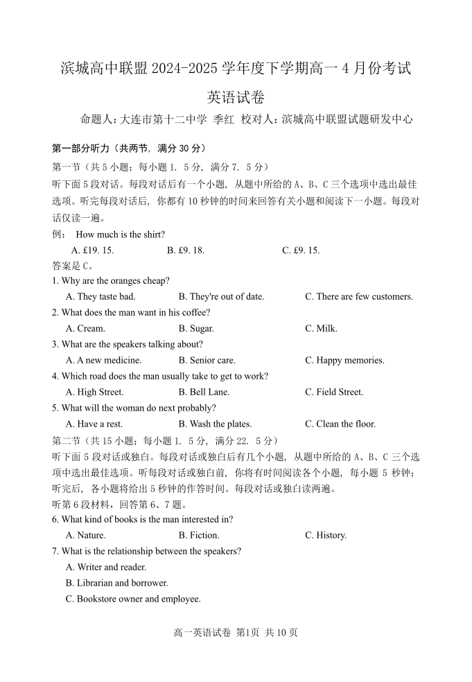 辽宁省大连市滨城联盟2024-2025学年高一下学期4月月考英语+答案