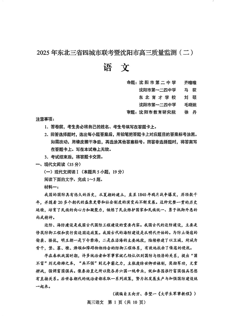 东北三省四市(哈沈长大)2025届高三联考暨沈阳市高三质量监测(二)语文