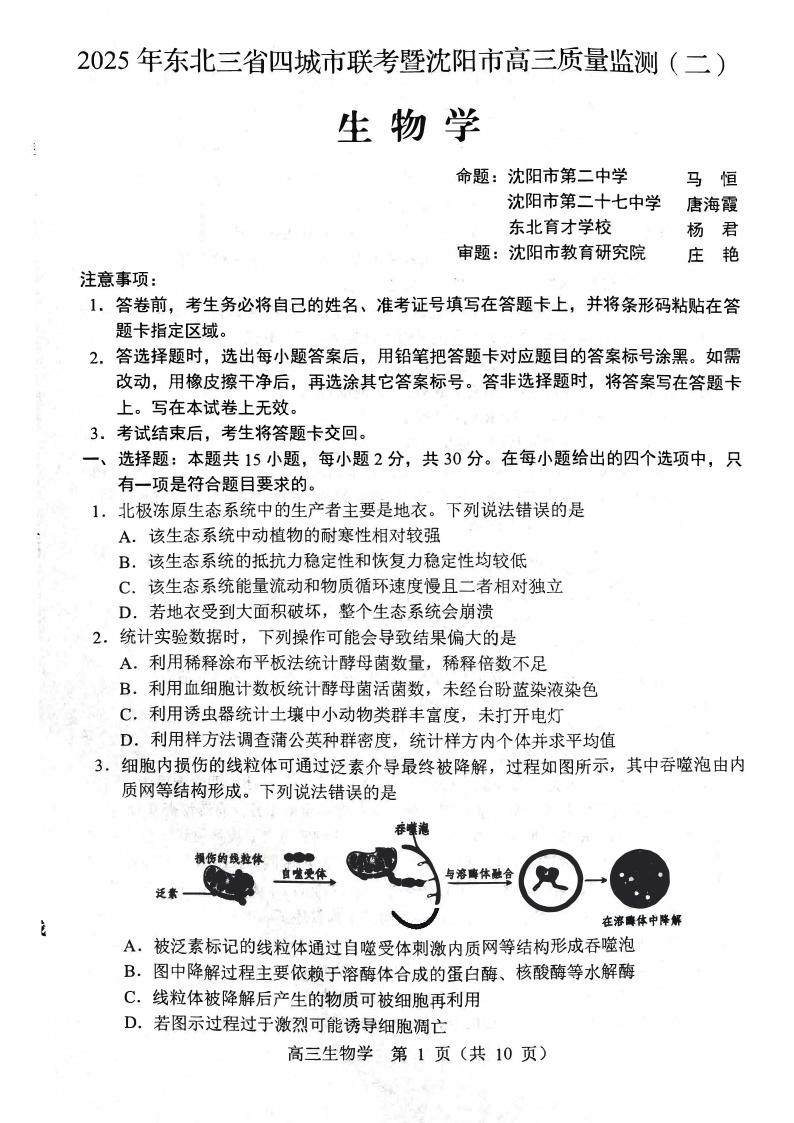 东北三省四市(哈沈长大)2025届高三联考暨沈阳市高三质量监测(二)生物