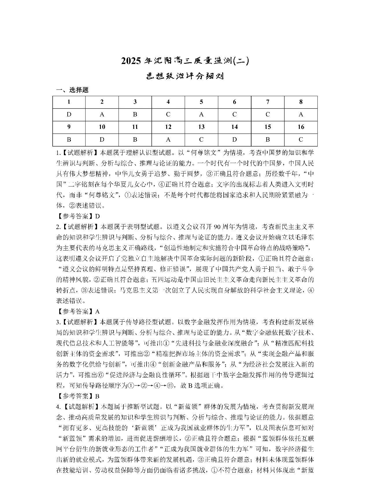 东北三省四市(哈沈长大)2025届高三联考暨沈阳市高三质量监测(二)政治答案