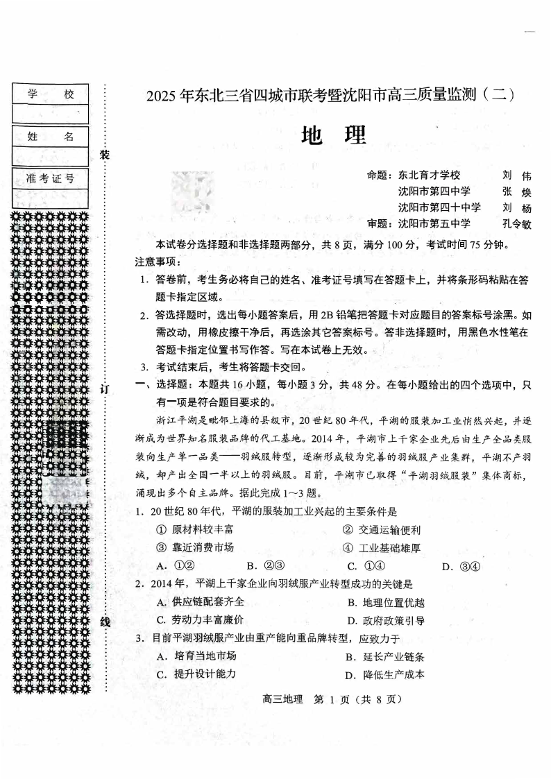 东北三省四市(哈沈长大)2025届高三联考暨沈阳市高三质量监测(二)地理