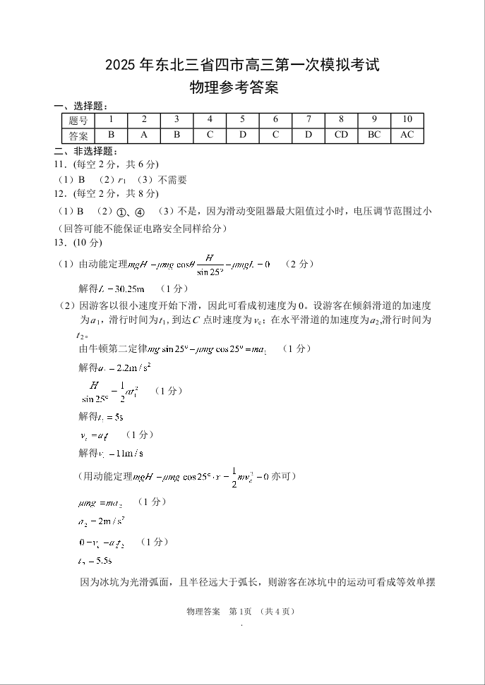 东北三省四市教研联合体2025届高考模拟考试(一)物理答案