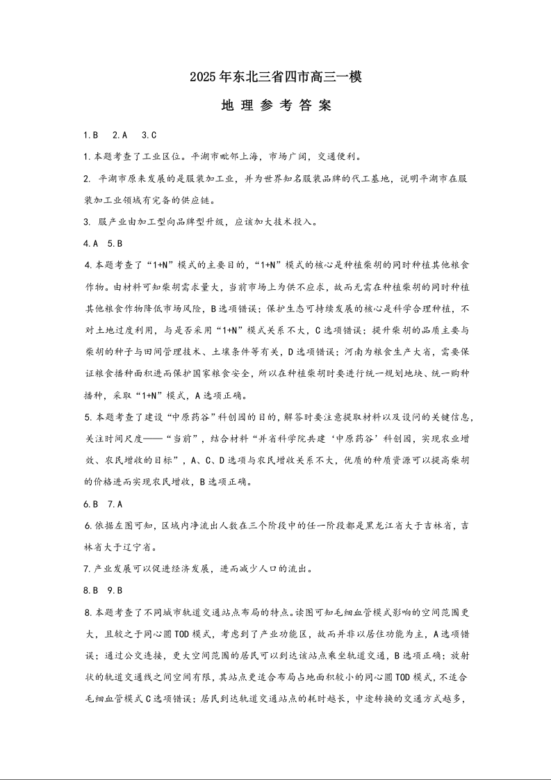 东北三省四市教研联合体2025届高考模拟考试(一)地理答案