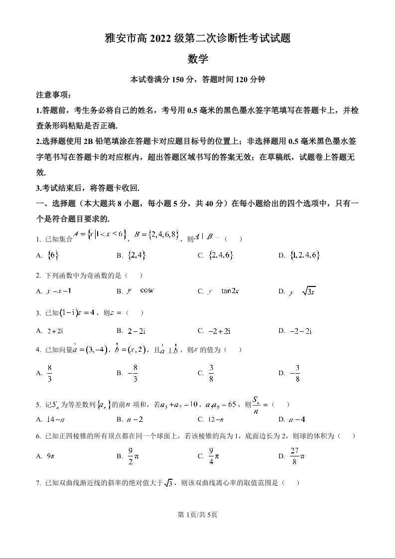 四川省雅安市2024-2025学年下学期高三二模诊断性考试数学(原卷版)