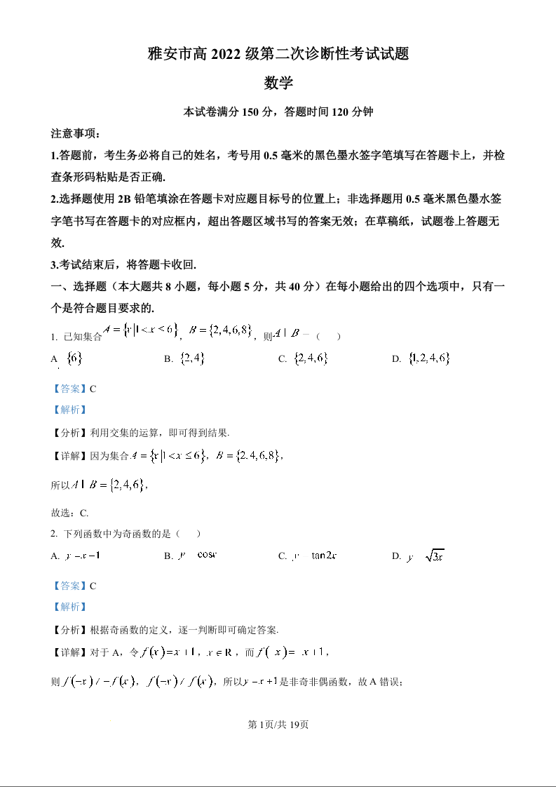 四川省雅安市2024-2025学年下学期高三二模诊断性考试数学(精品解析版)