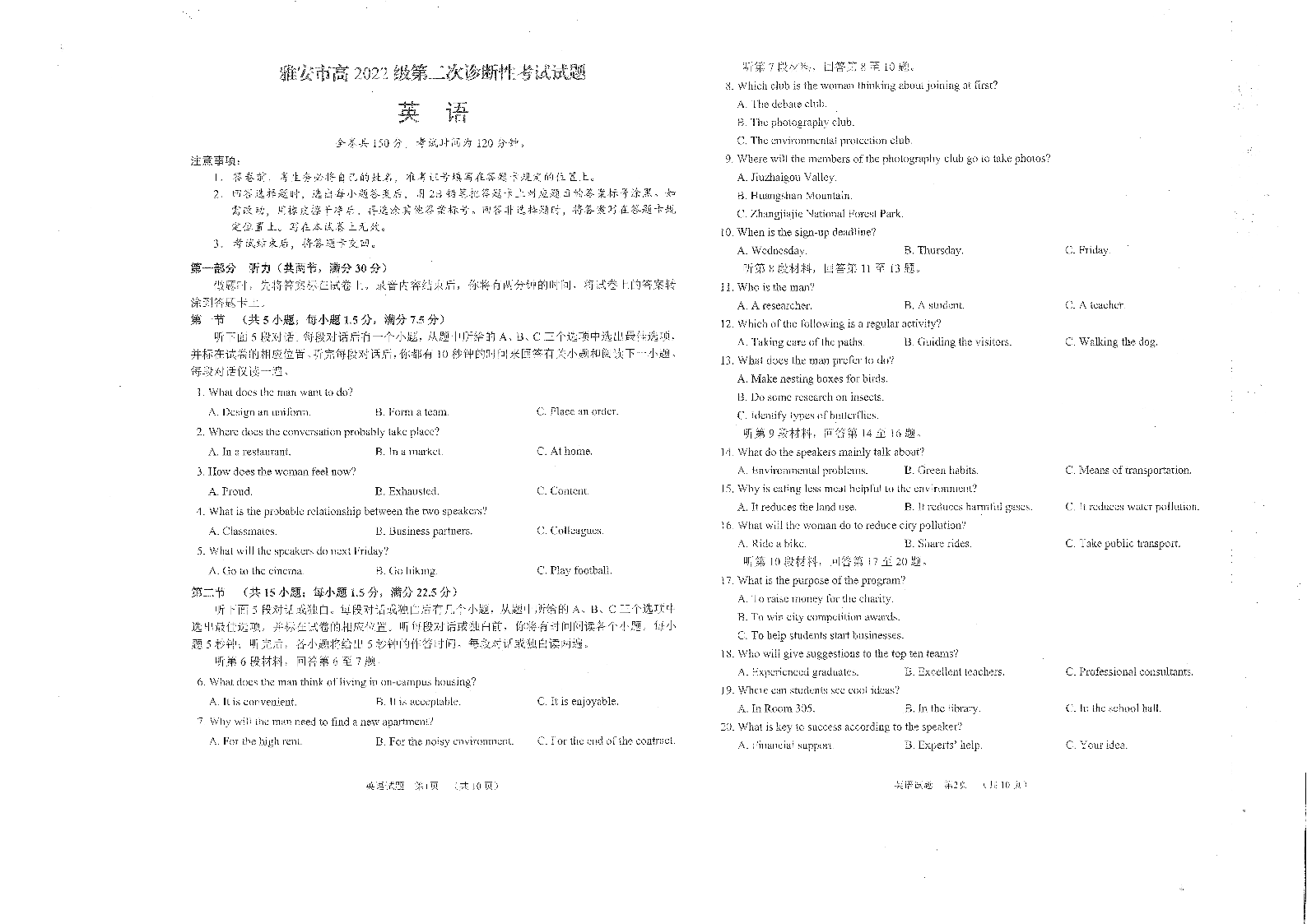 四川省雅安市2024-2025学年下学期高三二模诊断性考试英语