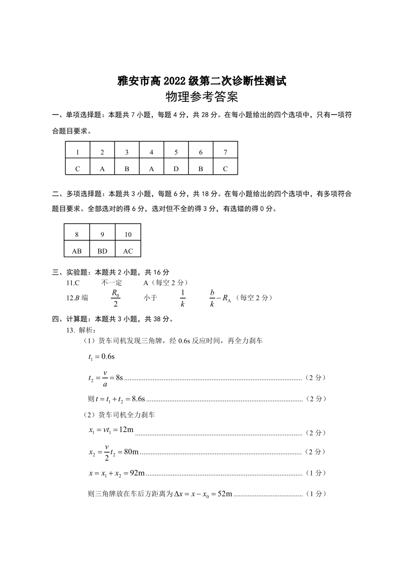 四川省雅安市2024-2025学年下学期高三二模诊断性考试物理答案