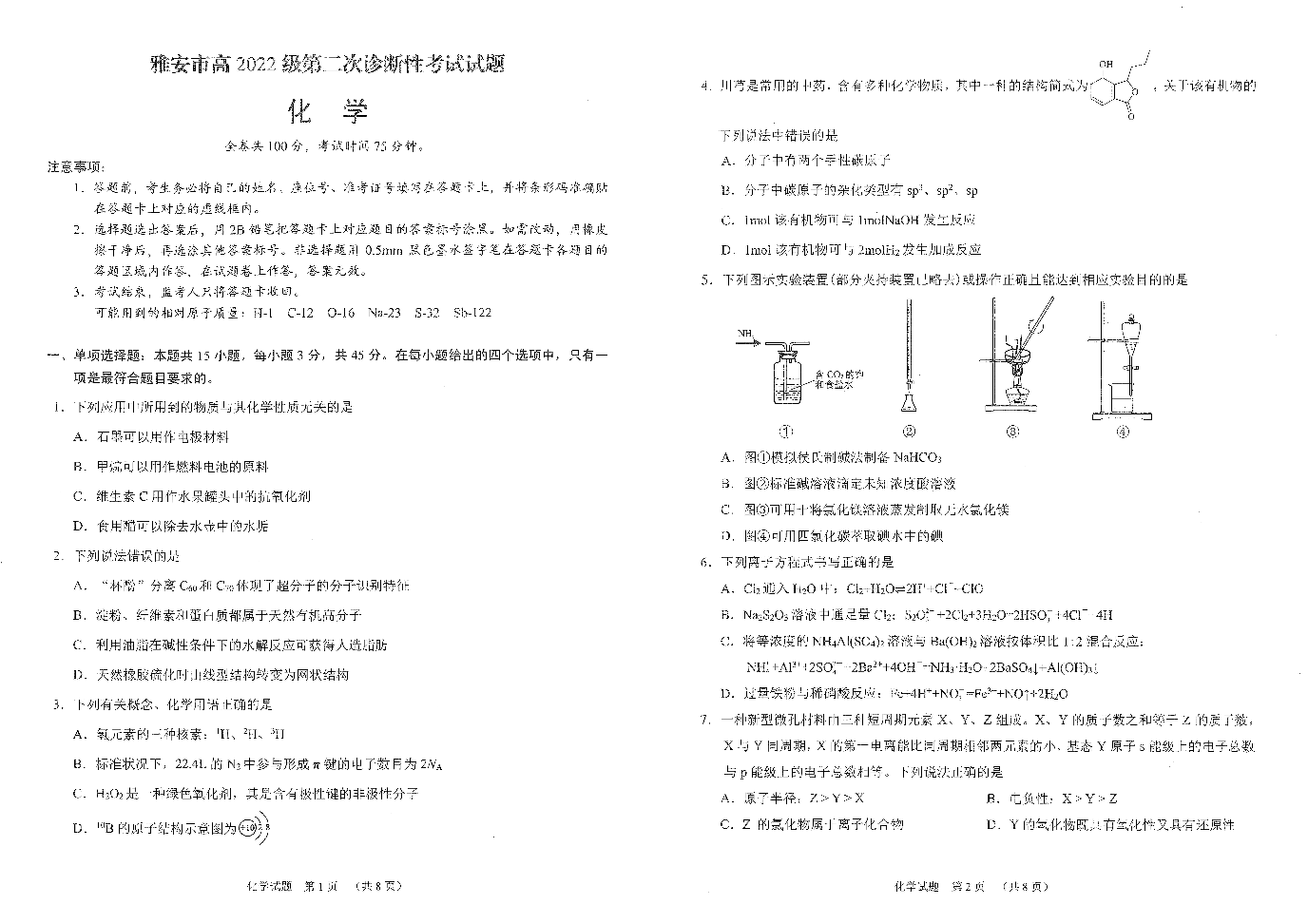 四川省雅安市2024-2025学年下学期高三二模诊断性考试化学