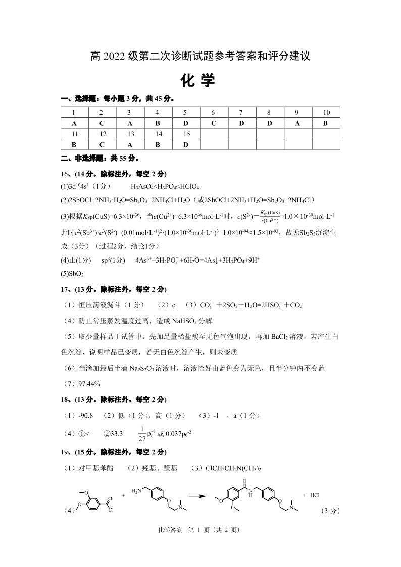 四川省雅安市2024-2025学年下学期高三二模诊断性考试化学答案