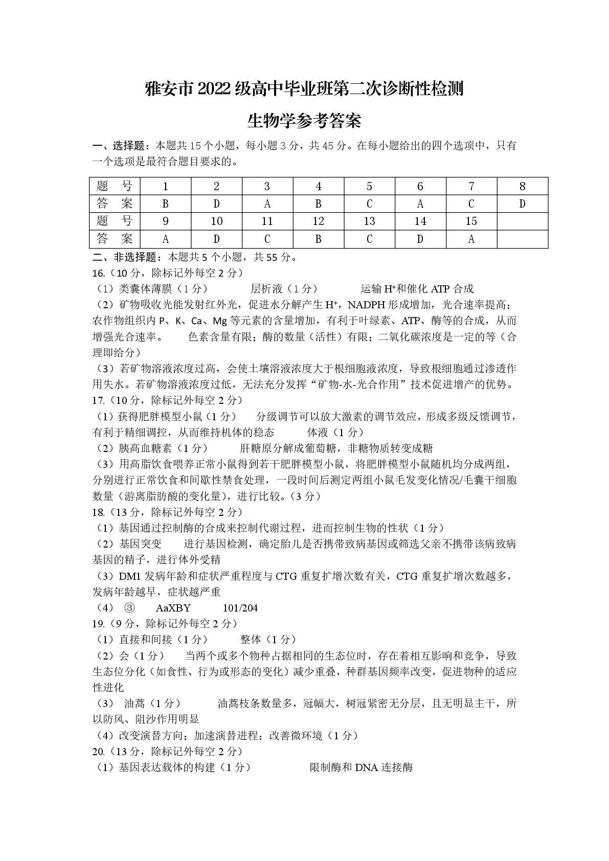 四川省雅安市2024-2025学年下学期高三二模诊断性考试生物答案