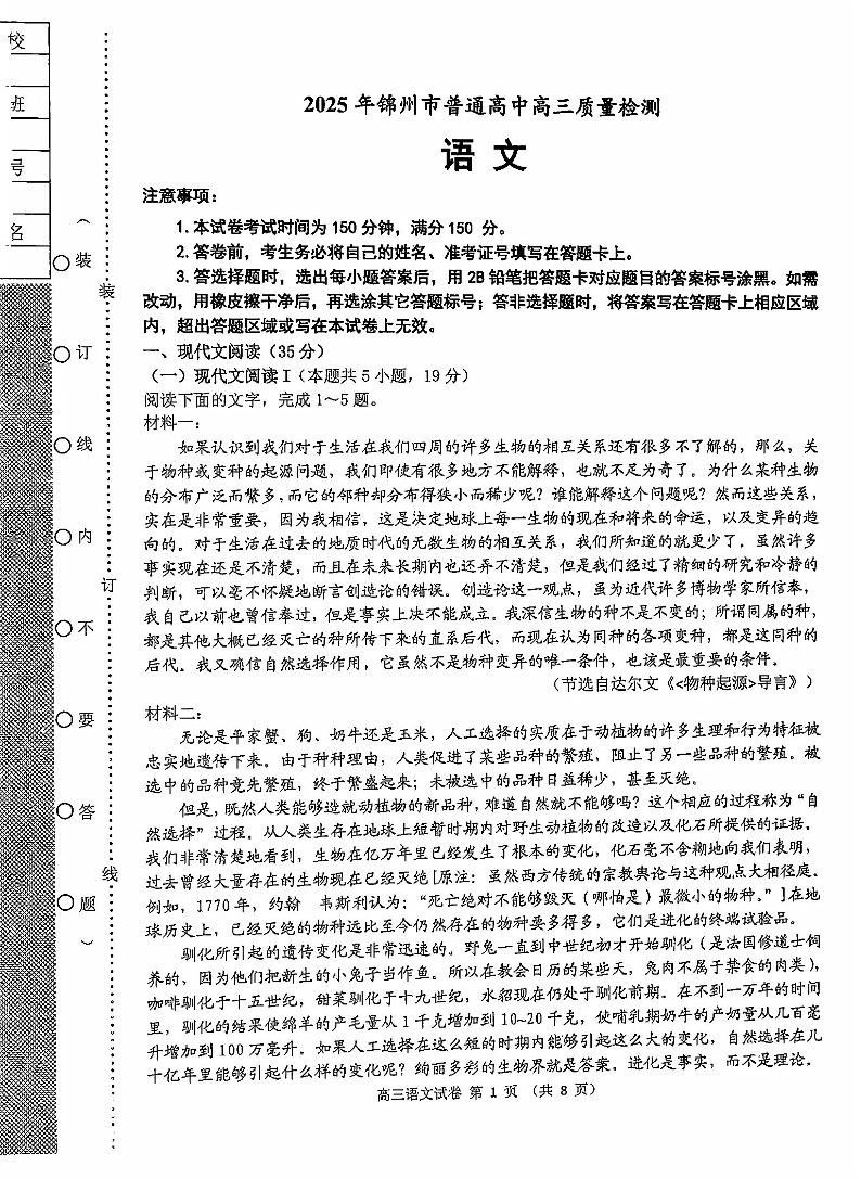 辽宁省锦州市2024-2025学年下学期4月高三一模质量检测语文