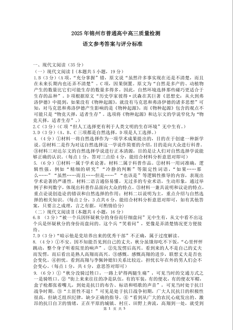 辽宁省锦州市2024-2025学年下学期4月高三一模质量检测语文答案