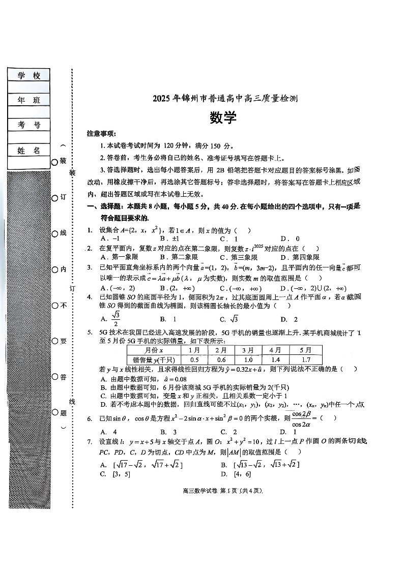 辽宁省锦州市2024-2025学年下学期4月高三一模质量检测数学
