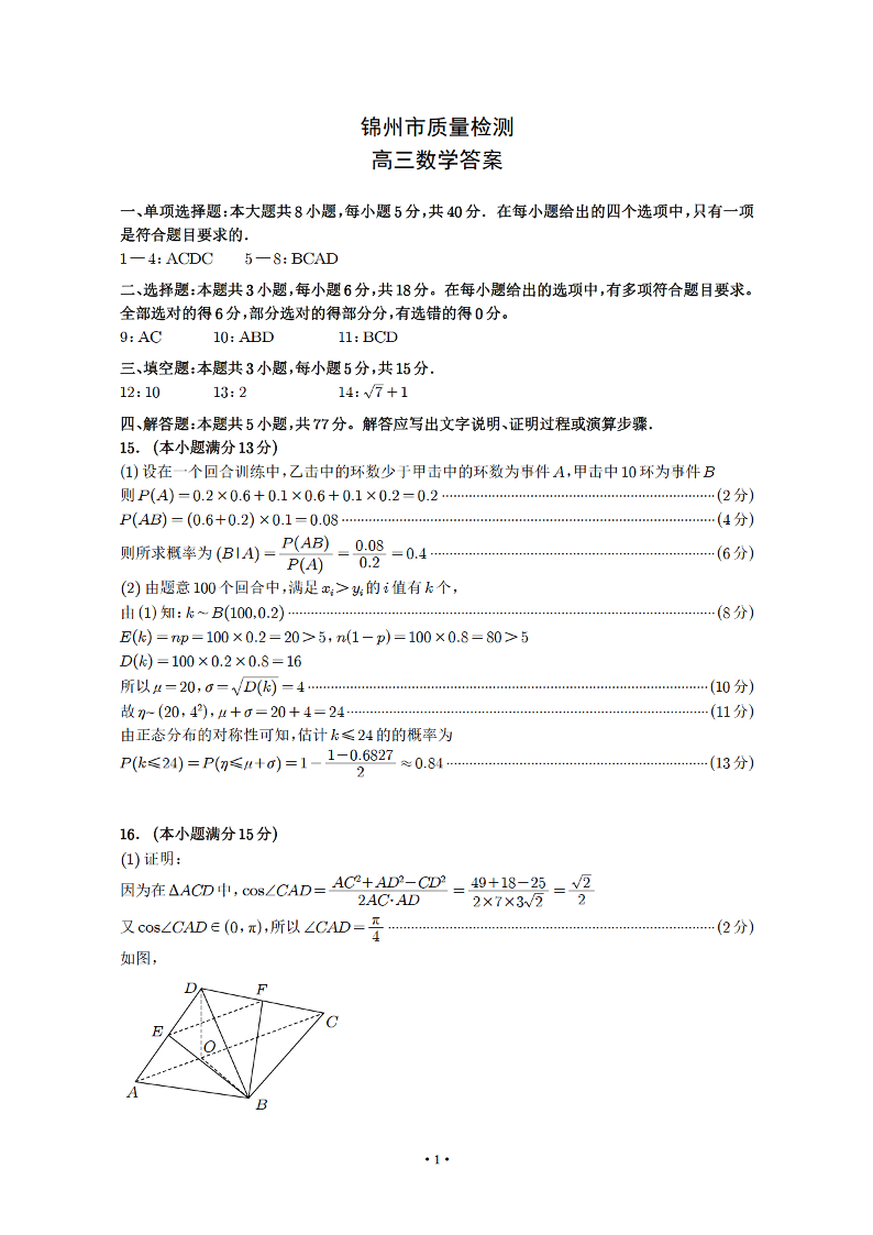 辽宁省锦州市2024-2025学年下学期4月高三一模质量检测数学答案