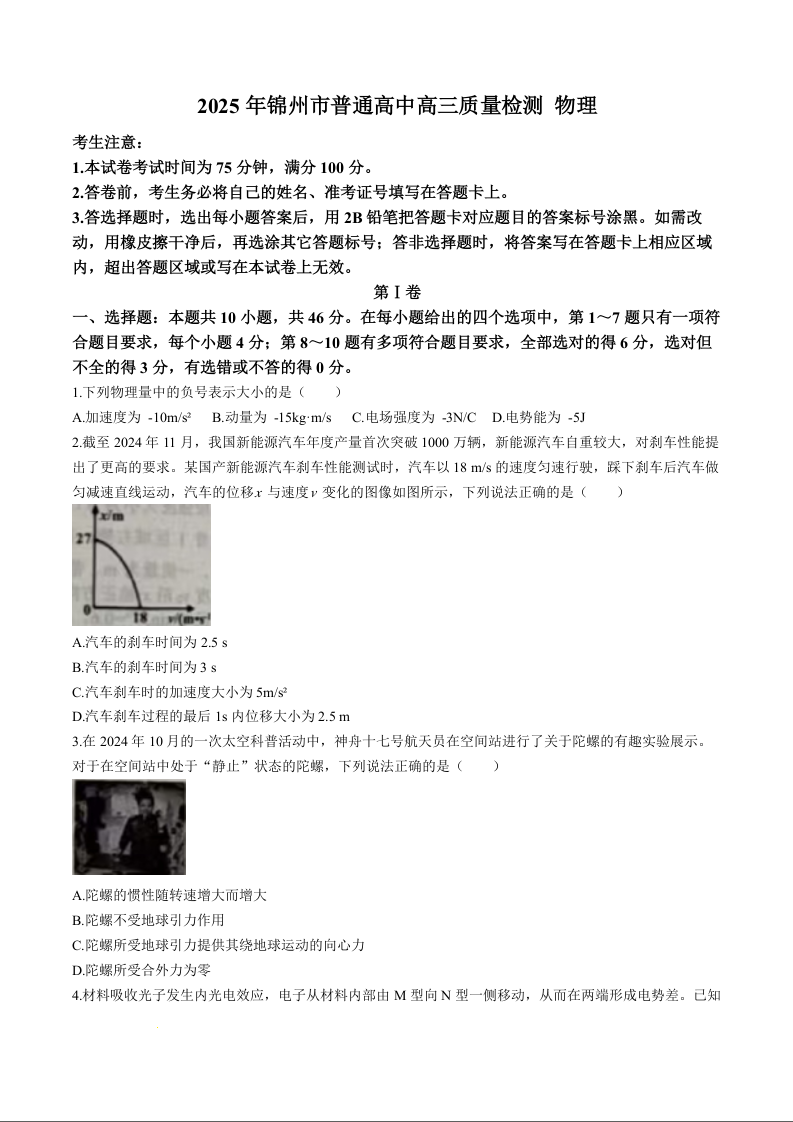 辽宁省锦州市2024-2025学年下学期4月高三一模质量检测物理+答案