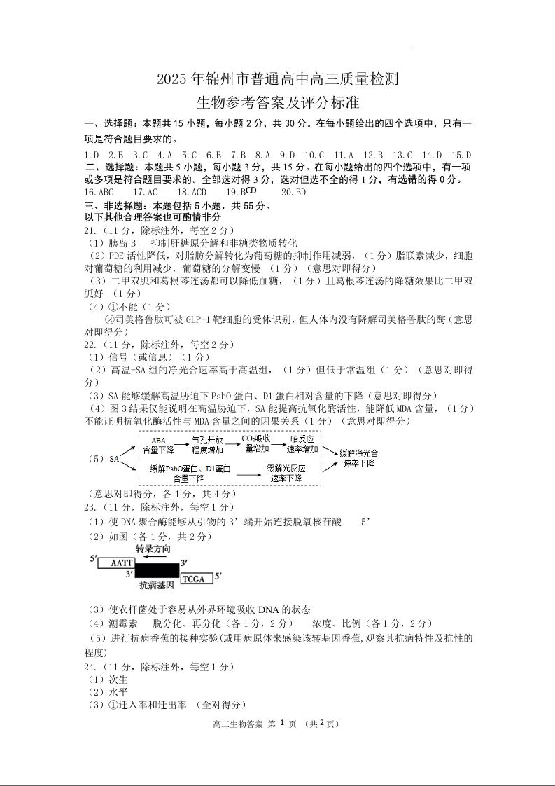 辽宁省锦州市2024-2025学年下学期4月高三一模质量检测生物答案