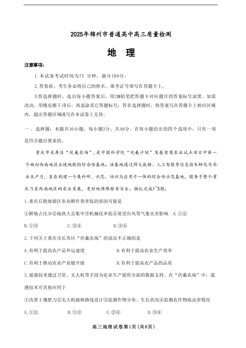 辽宁省锦州市2024-2025学年下学期4月高三一模质量检测地理