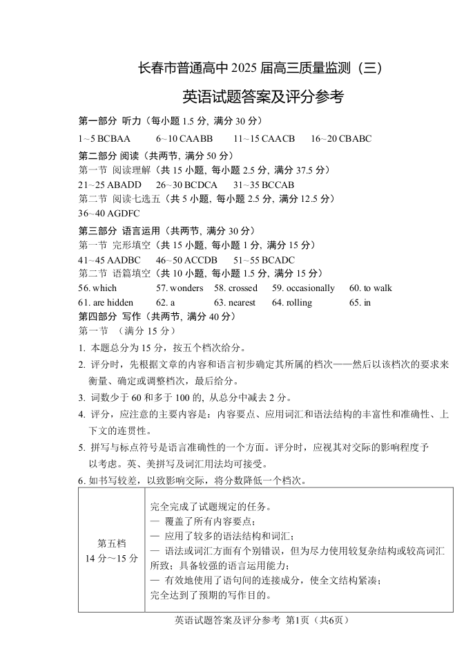 吉林省长春市2025-2025学年下学期高三质量监测(三模)英语答案