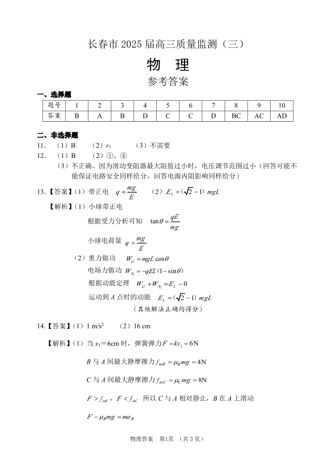 吉林省长春市2025-2025学年下学期高三质量监测(三模)物理答案