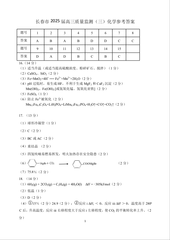 吉林省长春市2025-2025学年下学期高三质量监测(三模)化学答案