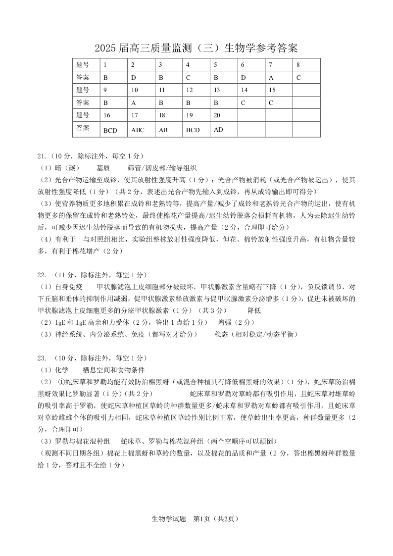 吉林省长春市2025-2025学年下学期高三质量监测(三模)生物答案